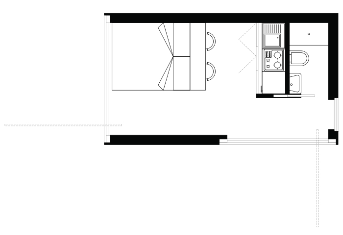 Nonostante le sue limitate dimensioni essa è completa di tutti i confort, al suo interno si trovano un angolo cottura, un bagno, una zona living e una zona notte.